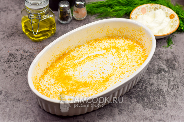 Форму для духовки смажьте немного маслом и присыпьте панировочными сухарями.