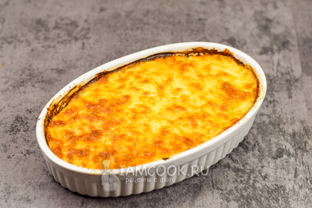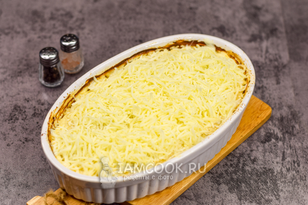 Спустя время уберите фольгу, запеканку посыпьте оставшимся тертым сыром, снова уберите в духовку. Готовьте еще 10-12 минут.