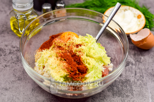 Сдобрите все ингредиенты солью, перцем, добавьте паприку и сушеный чеснок.
