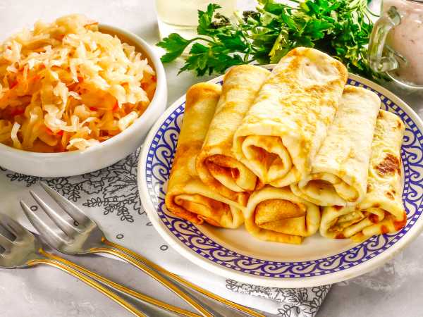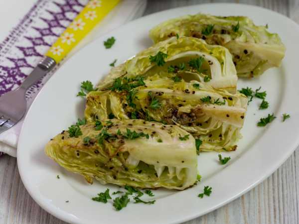 Подайте красочную запеченную квашеную капусту к столу теплой с различными соусами, мясными или колбасными изделиями.