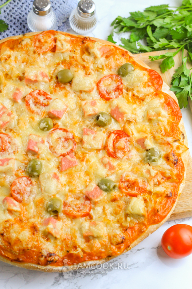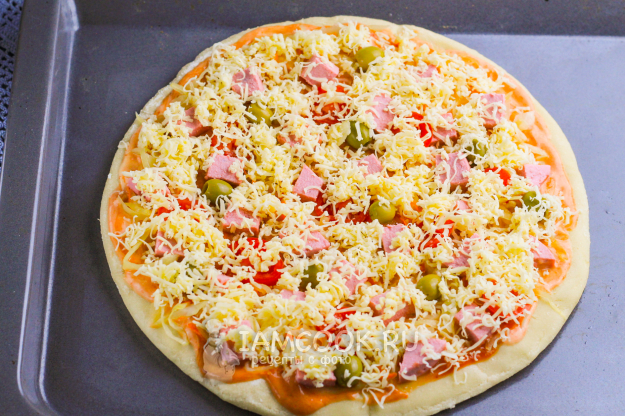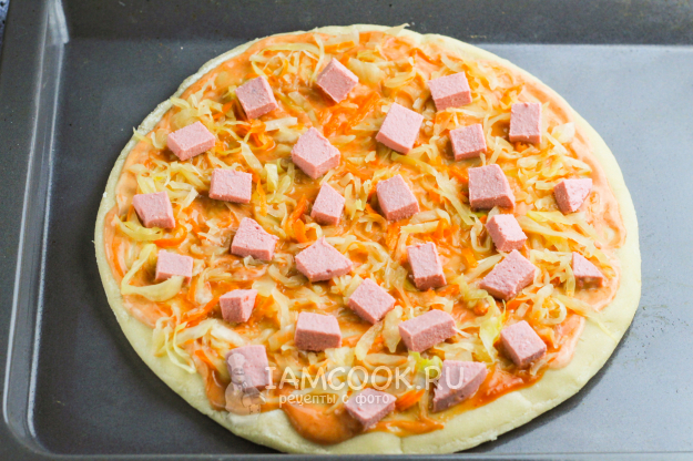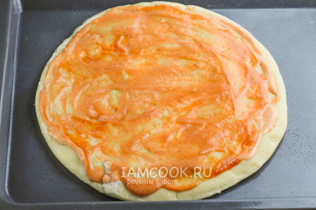 Выложите на противень корж для пиццы и обмажьте его кетчупом, смешанным с майонезом.