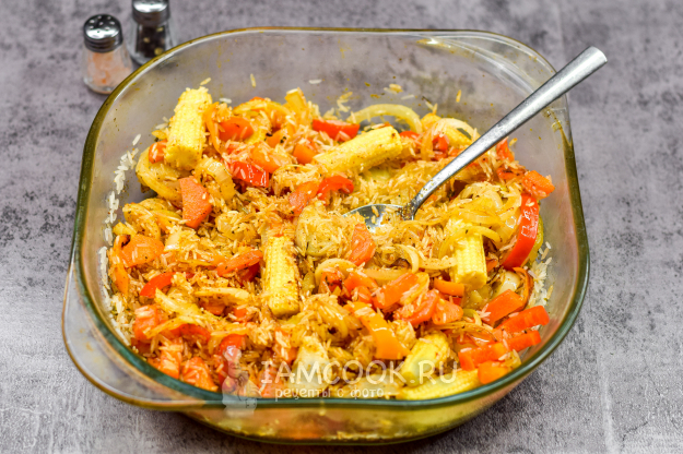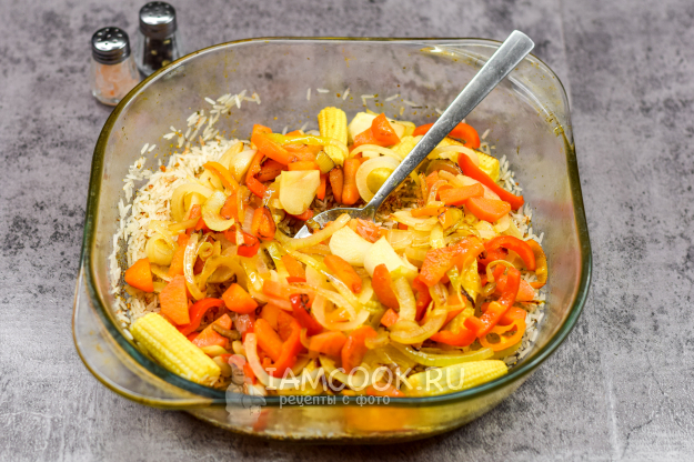Возьмите глубокую форму для духовки и смажьте маслом. Переложите в форму рис, добавьте соль и перец, немного паприки. Переложите к рису овощи со сковороды.