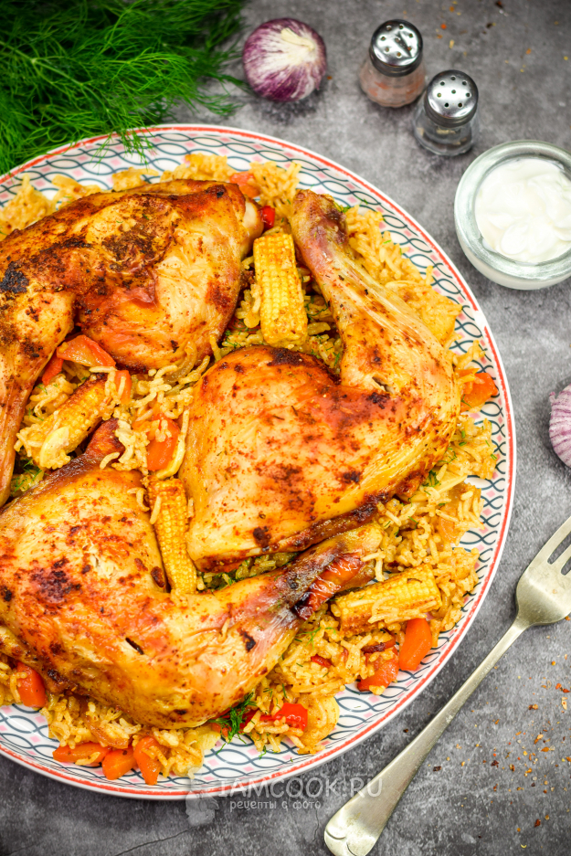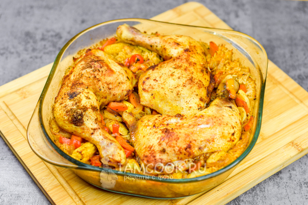 Запекайте окорочка с рисом в духовке 60 минут. Спустя время фольгу удалите, верните форму в духовку и готовьте еще 10-15 минут. Готовое блюдо подавайте к столу.