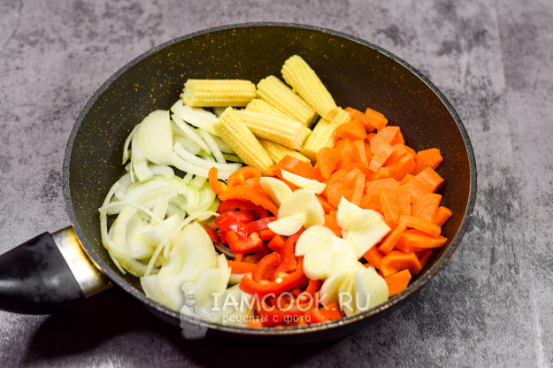 Очистите овощи - лук, морковь, чеснок, перец. Сполосните и просушите их. Нарежьте лук полукольцами, морковь - брусочками, перец - полосками, чеснок - пластинами. Кукурузу в початках просто разрежьте пополам. В сковороде разогрейте одну ложку масла и переложите овощи, поджарьте буквально несколько минут, чтобы они приобрели легкую румяную корочку.