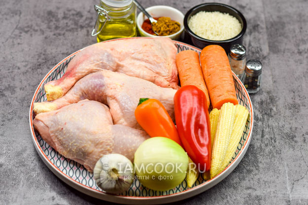 Соберите продукты для приготовления куриных окорочков с рисом в духовке. Сразу включите духовку и установите температуру 180 градусов, пусть разогревается.