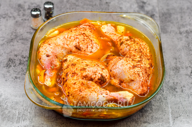 Влейте в форму воду, выложите маринованные окорочка. Форму запечатайте фольгой и поставьте в духовку.