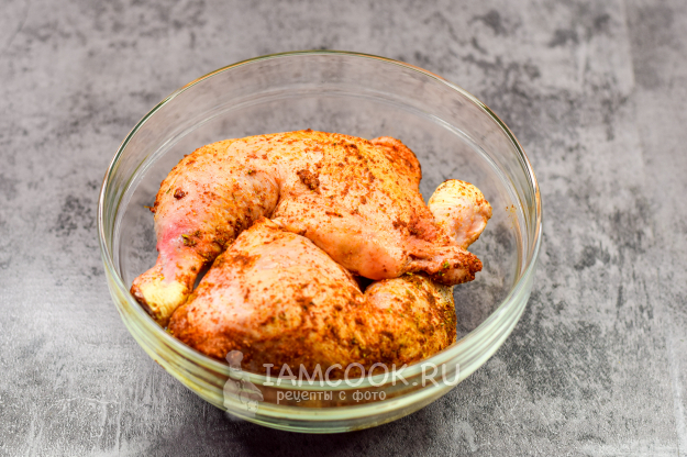 Куриные окорочка просушите кухонными бумажными полотенцами. После натрите окорочка солью, перцем, паприкой, хмели-сунели. Пусть окорочка маринуются, пока мы подготовим остальные компоненты.
