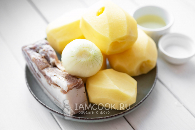 Чтобы приготовить клецки из сырого картофеля, сразу же соберём все ингредиенты по списку. Лук и картофель помоем и ополоснем в проточной воде.