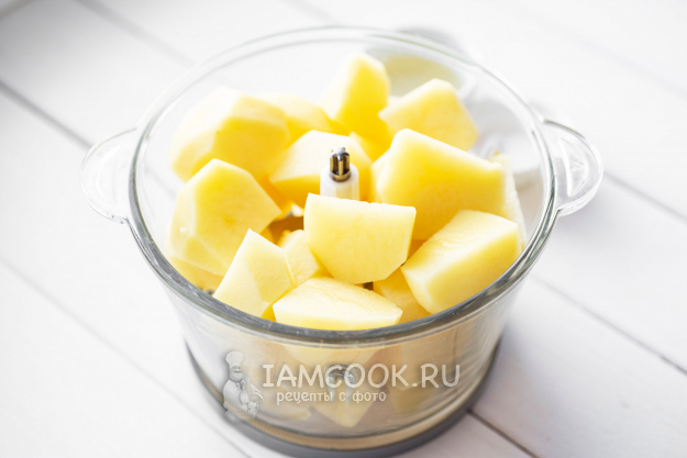 Картофель нарежем кусочками среднего размера для удобства работы в блендере. Выложим все картофельные кусочки в чашу блендера.