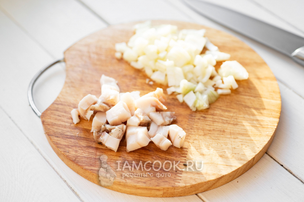 Параллельно мелко нашинкуем репчатый лук и нарежем маленькими кубиками сало.