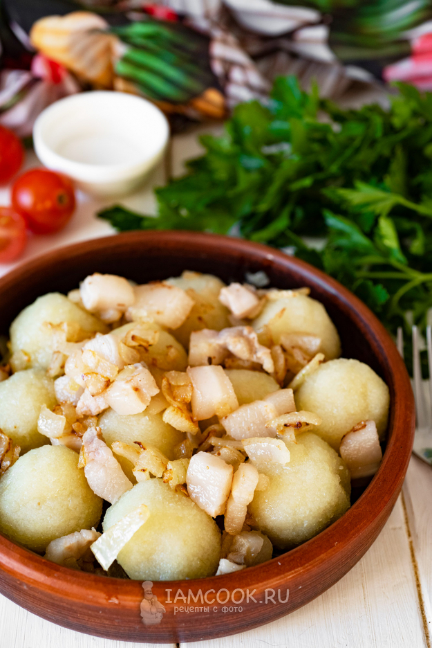Содержимое сковороды выкладываем в тарелку поверх клецок и подаем к столу. Приятного аппетита!