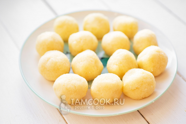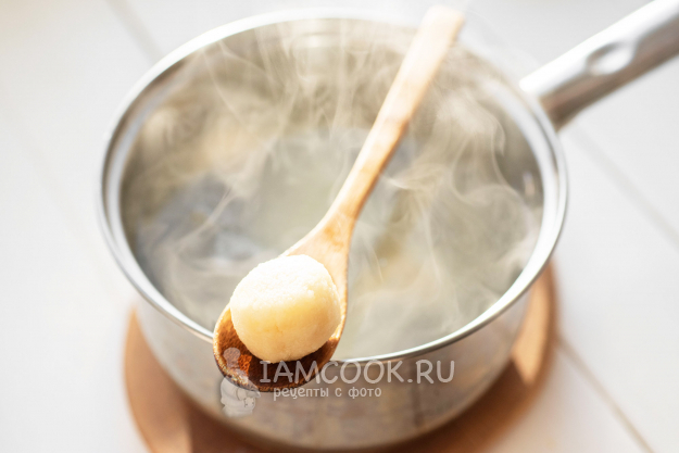 Из этой массы сформируем шарики-клецки размером примерно с грецкий орех среднего размера. Поставим на плиту сотейник с водой и подождем закипания жидкости.