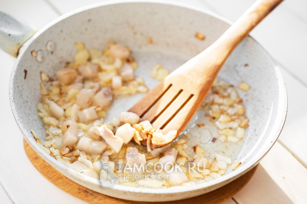 В сковороде разогреем растительное масло, выложим мелко нашинкованный лук, обжариваем 3-4 минуты, затем выкладываем сало и все вместе обжариваем до легкой золотистой корочки сала.