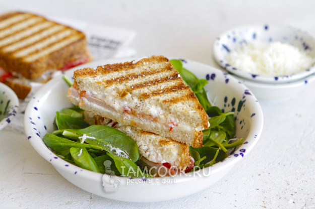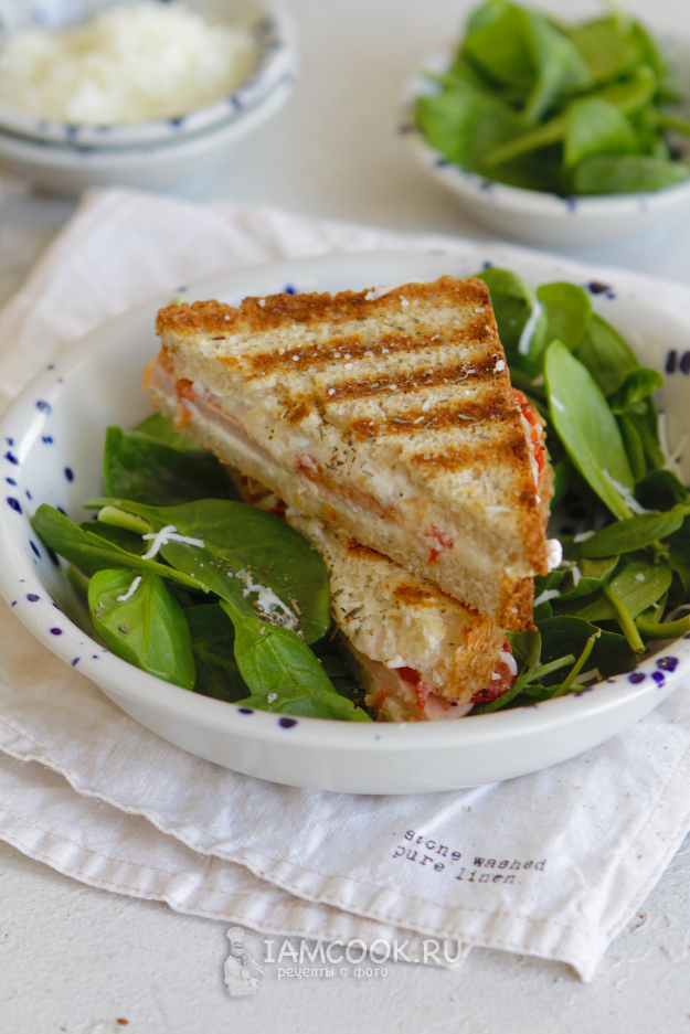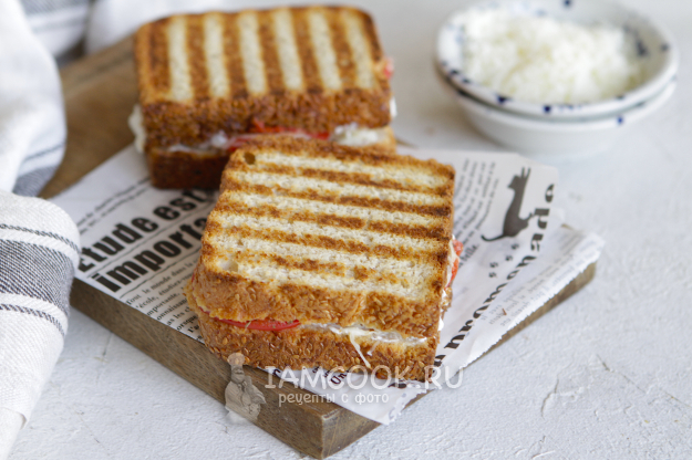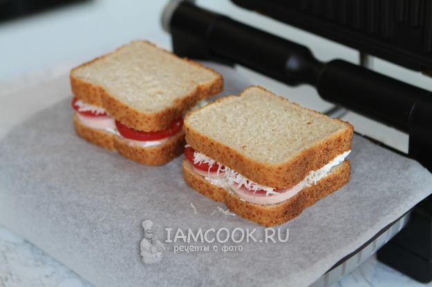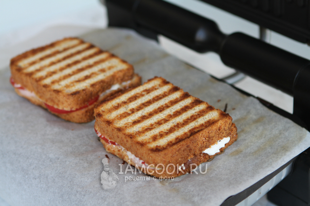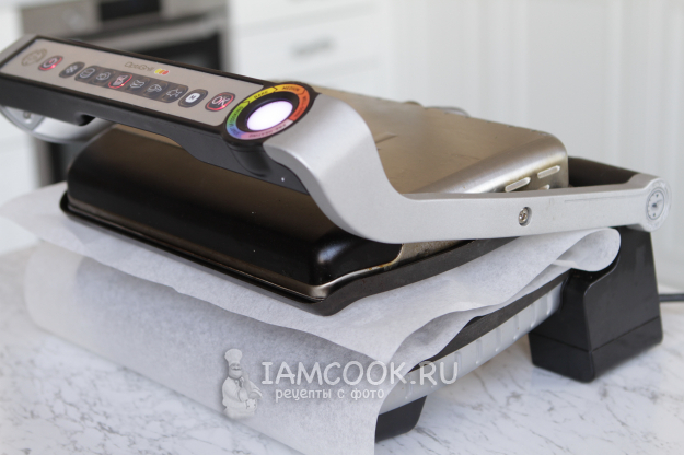 Чтобы панели не испачкались, подготовьте два листа пергамента. Нижнюю панель застелите пергаментом, выложите наши сэндвичи. Прикройте вторым листом пергамента и закройте гриль, слегка прижав верхнюю крышку.