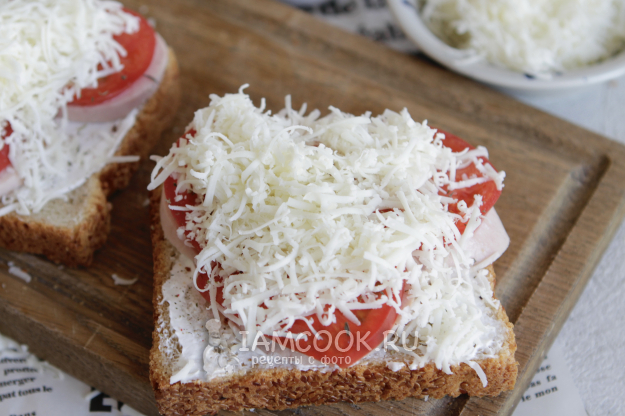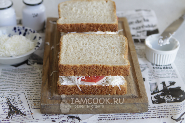 Для сэндвичей в идеале выбрать сыр, который хорошо плавится. Я добавляла сыр моцарелла. Можно нарезать его на кусочки, а можно натереть на терке, как на фотографии.