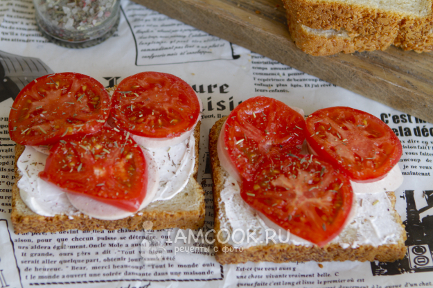 Один крупный или два небольших помидора промыть и обсушить. Нарезать на кружочки диаметром 5-7 мм. Помидоры выложить сверху. Слегка посолить и присыпать прованскими травами.