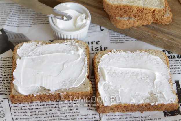 Подготовить 4 кусочка хлеба. Каждый кусочек хлеба смазать творожным сыром.