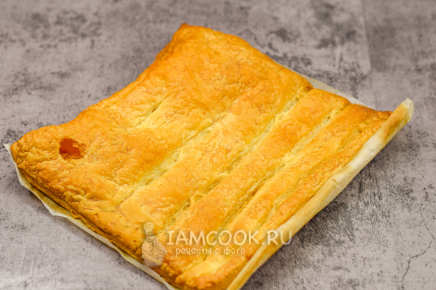 Слоеное тесто немного раскатайте скалкой, после переложите на противень и отправьте в духовку. Запекайте корж 12-15 минут, при надобности - дольше, пока он не станет румяным. После приготовления остудите корж и поломайте на произвольные кусочки.