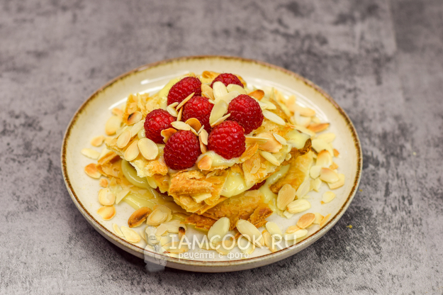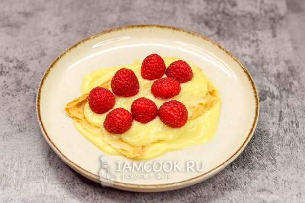 Теперь можно собирать десерт. Возьмите порционную тарелку, выложите немного крема, поверх крема уложите кусочек слоеного хрустящего коржа.