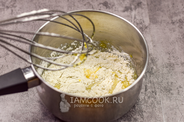 Первым делом, пока разогревается духовка, сварите крем. Для этого возьмите сотейник, вбейте в него одно куриное яйцо, добавьте сахар, ванильный сахар, перетрите все венчиком. Следом всыпьте сюда же пшеничную муку, перемешайте все венчиком.