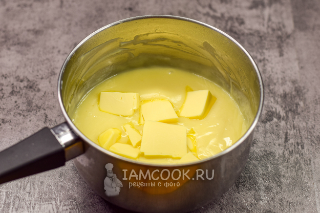 Теперь добавьте в крем сливочное масло, нарезанное кусочками. Перемешивайте крем венчиком до тех пор, пока все масло не растопится.