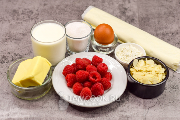Подготовьте ингредиенты для десерта из слоеного теста и заварного крема. Также сразу включите и разогрейте духовку, установите температуру 180 градусов.