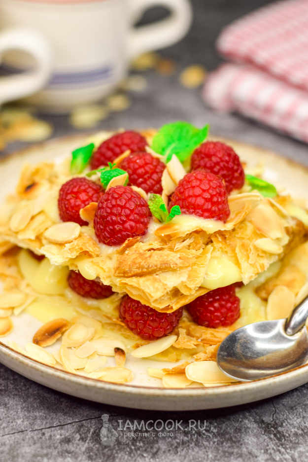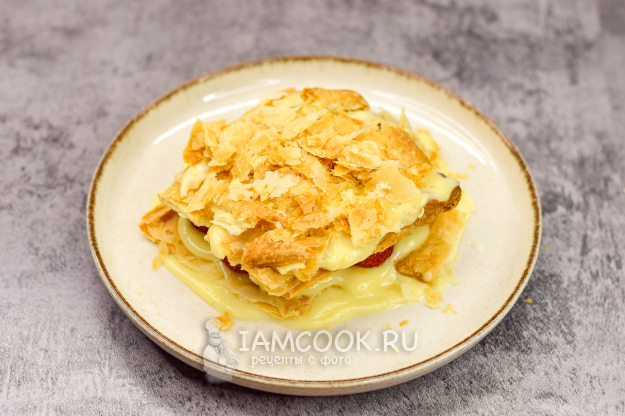 Если крем и корж остались, десерт из слоеного теста и заварного крема можно приготовить и на следующий день.