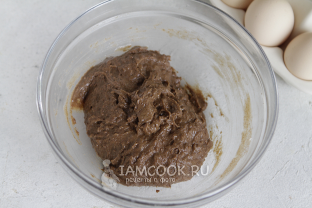 Перемешать все ингредиенты до увлажнения муки. Долго тесто вымешивать не стоит и удобнее всего перемешивать ингредиенты лопаткой. Тесто получится вязким, липким. Больше муки не добавляем.