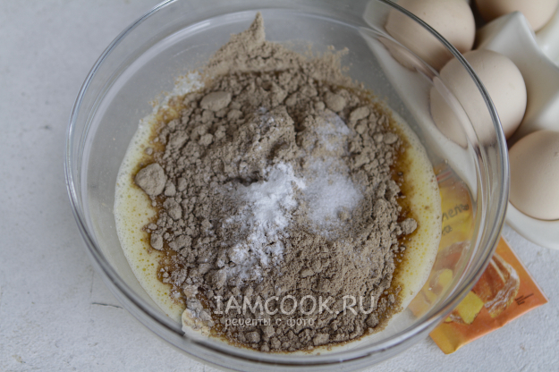 Ввести муку, разрыхлитель и щепотку соли. Льняную муку, как и семена льна, можно купить в любом продуктовом магазине. Я предпочитаю печь хлеб из готовой покупной муки, нежели перемалывать семена льна самостоятельно. Так как в готовой муке отсутствует льняное масло, в отличие от размолотых в домашних условиях семян льна.