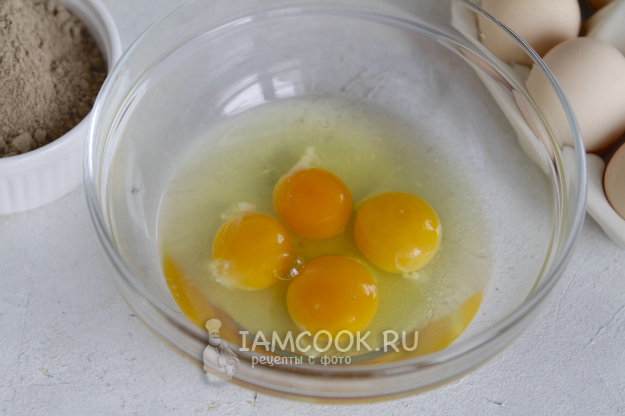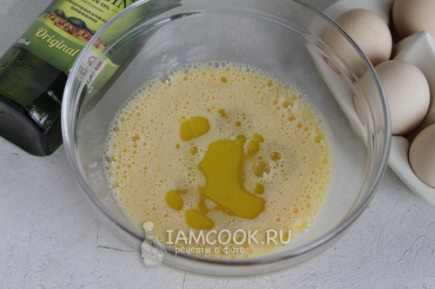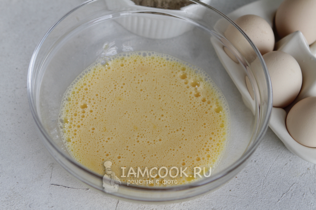 Яйца взбить венчиком или миксером до образования пышной пены.