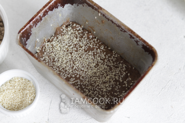 Выложить тесто в форму. Разровнять верхушку лопаткой. Присыпать семенами кунжута.