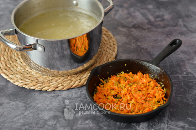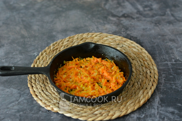 Для зажарки нарежьте мелко лук, а морковь натрите на тёрке. На разогретом масле пассеруйте овощи, помешивая, до золотистого цвета. Готовую зажарку снимите с плиты.