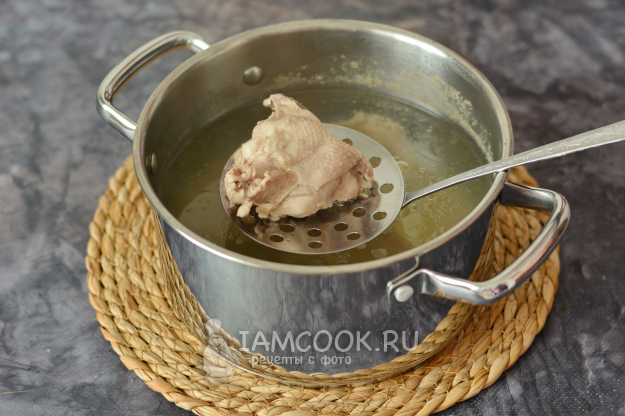 Шумовкой выньте куски курицы из бульона, немного остудите и снимите с косточек всё мясо, пока отложив его в сторонку.