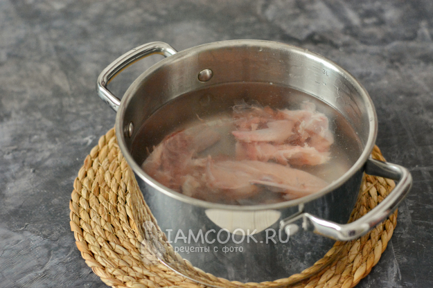 Для этого залейте куриный суповой набор водой и доведите до кипения на сильном огне. Тщательно снимите всю пену. Затем снизьте нагрев и на тихом огне варите бульон около 1 часа. В процессе варки добавьте соль по вкусу.