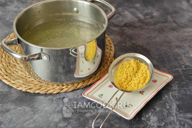 Пшено тщательно промойте на сите горячей водой и засыпьте в бульон. Прибавьте огонь под кастрюлей.