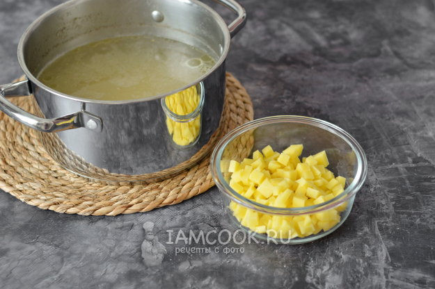 Как только пшено закипит, добавьте в кулеш нарезанный кубиком картофель. Варите всё вместе около 15-20 минут на среднем огне.
