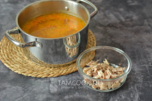 В конце варки добавьте куриное мясо, которое вы сняли с косточек.