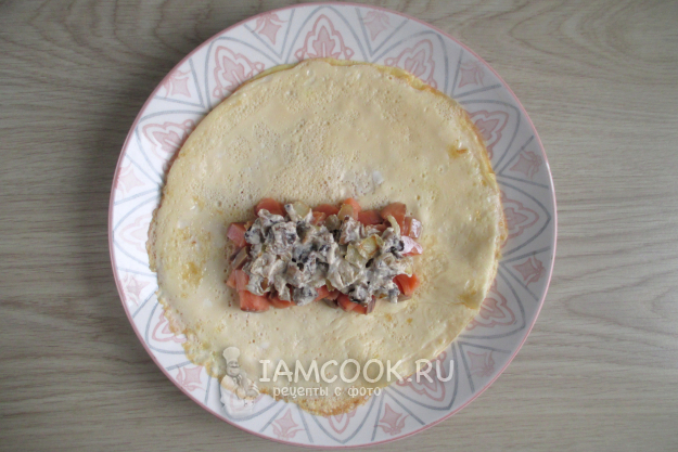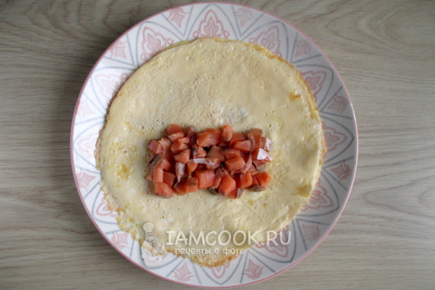 На первый омлетик уложите половину нарезанной кубиком рыбы.