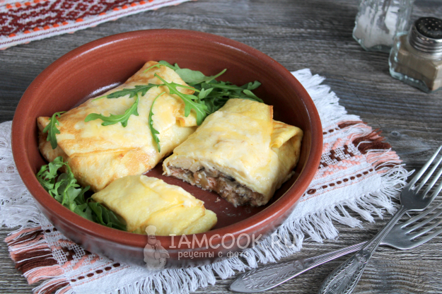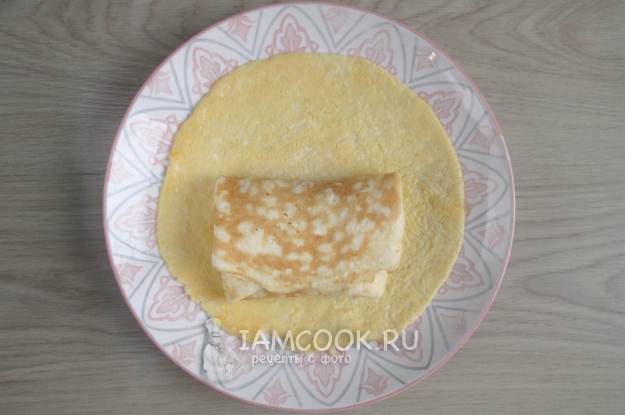 Для «конвертов» нужно приготовить два тонких омлета. Для одного омлета соедините и перемешайте до однородного состояния два яйца, 1 ст.л. воды и щепотку соли. Вылейте массу на разогретую с маслом (например, смесь сливочного и растительного) сковороду и на среднем огне под крышкой пожарьте омлет с одной стороны. Верх схватился - значит готово. Аналогично приготовьте и второй омлетный блинчик.
