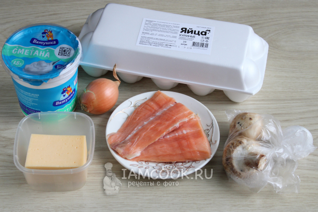 Для рыбы «в конверте» подготовьте ингредиенты по списку к рецепту. Покажу приготовление на примере красной рыбы. Для начинки она может быть нарезана кубиками или оставлена в виде порционного филе. Подходят кета, нерка, кижуч, горбуша и т.п. Жирность сметаны не принципиальна и можете заменить её сливками.