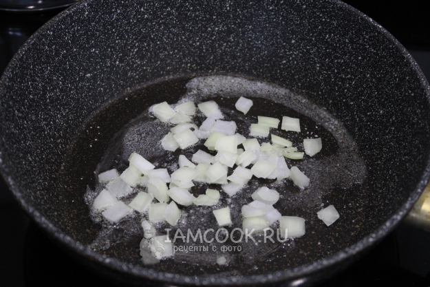 Для начинки нарежьте филе красной рыбы, лук и шампиньоны средним кубиком. На сковороде на смеси сливочного и растительного масел (по 1 ч.л.) сначала слегка обжарьте лук.