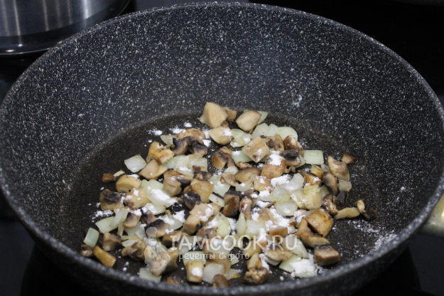 Затем добавьте к луку кусочки шампиньонов и пожарьте все вместе при помешивании 3-4 минуты на среднем огне. Потом посыпьте их солью и мукой, продолжайте обжаривать при помешивании около минуты.