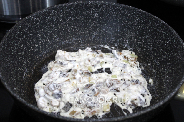 На неё распределите половину начинки из шампиньонов со сметаной.