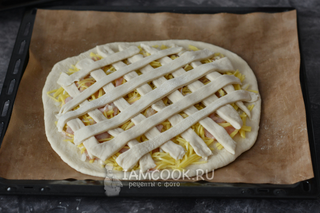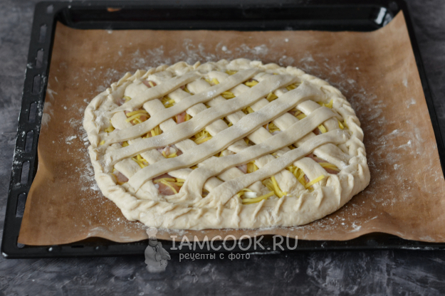 А теперь, подгибая нижний пласт кверху, защипайте края, соединяя их с решёткой из теста.