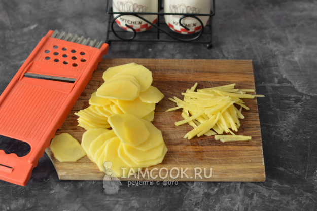 Сырой картофель нужно нарезать тонкой "спичкой". Для этого я сначала шинкую его на специальной тёрке тонкими кружочками, а затем уже ножом режу соломкой.