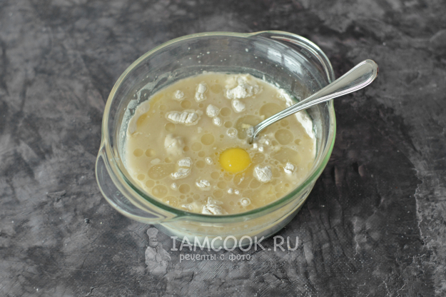 Просейте в миску муку, добавьте в неё сухие инстантные дрожжи, соль и сахар. Венчиком соедините всё, чтобы сухие ингредиенты перемешались. Теперь влейте воду, вбейте яйцо и добавьте растительное масло.