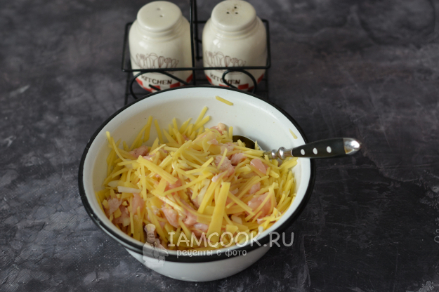 Соедините нарезанный картофель, куриное филе и лук. Посолите и поперчите по вкусу и перемешайте начинку.