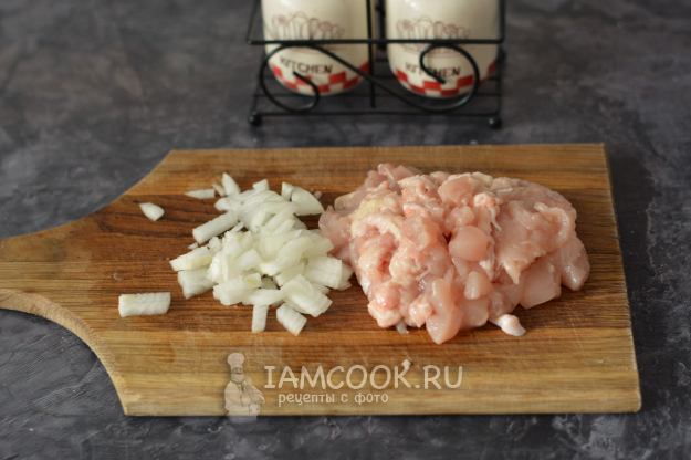 Куриное филе и лук нарежьте мелко.