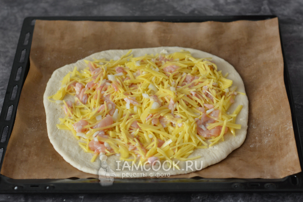 Ту, что побольше, раскатайте в тонкий пласт и выложите на противень, застеленный пергаментом. На нижний пласт теста распределите начинку. Важно распределить начинку не очень толстым слоем, иначе сырой картофель не пропечётся.