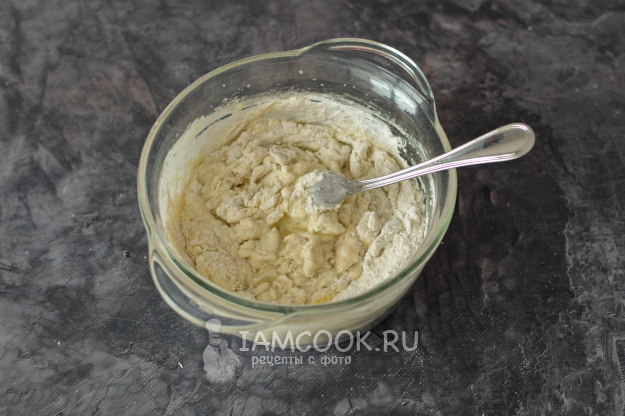 Как только мука смешается с жидкостью, вилку уберите и продолжите замес руками. Соедините тесто в единый комок.